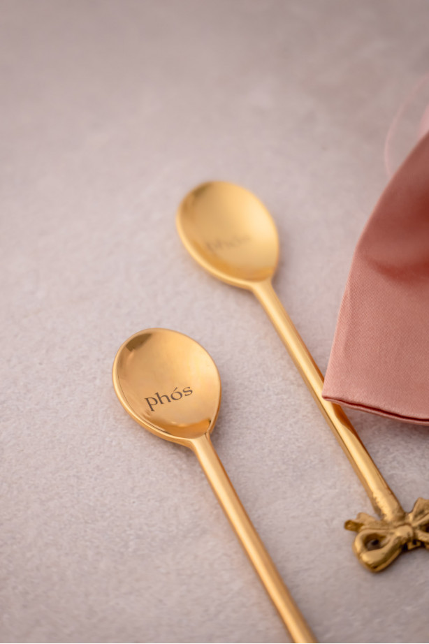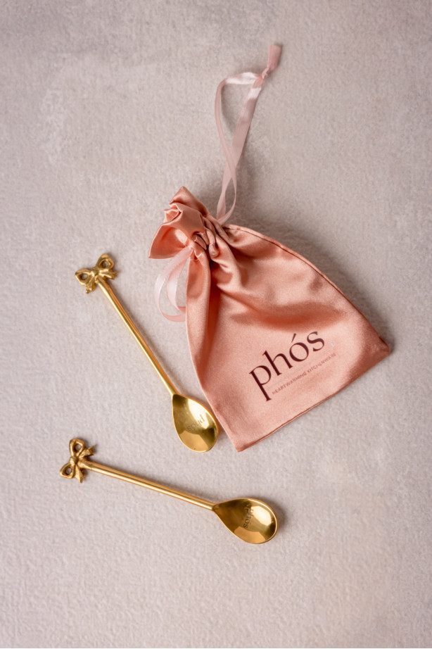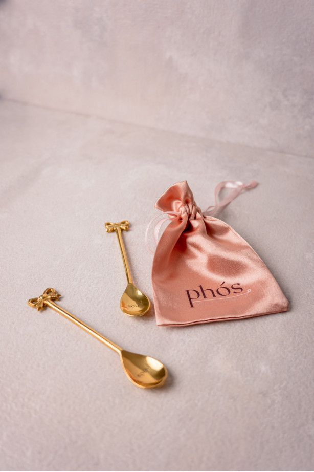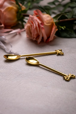Σετ 2 κουταλιών του γλυκού από επιχρυσωμένο ορείχαλκο. Διακοσμημένα με κομψούς φιόγκους. Ιδανικά για ροφήματα ή επιδόρπια. Κατάλληλα για πλυντήριο πιάτων.